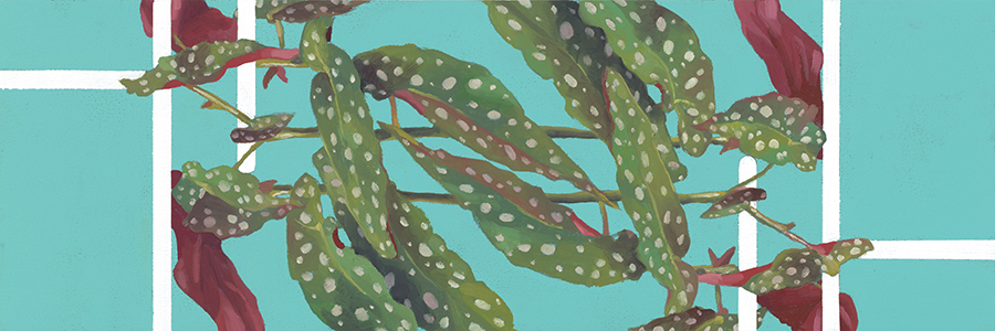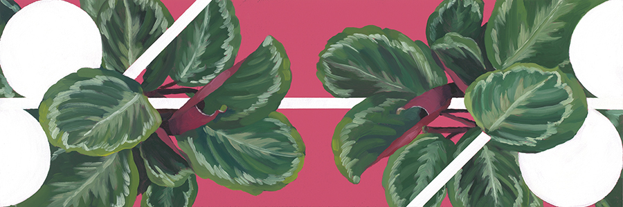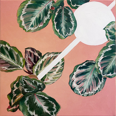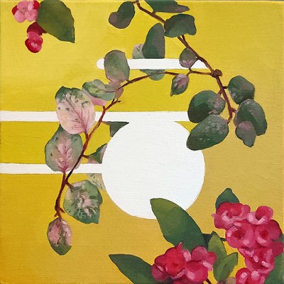The “Streetlights” series was originally commissioned by Palo Alto Public Art and was inspired by historic California Avenue district as a local, unique, culturally rich and ever evolving community. In these paintings, various plants create patterns and paths with their natural growth; clustering, radiating, reaching. Laid out on a long surface, the vines, stems, and leaves form organic paths similar to the directional flow of foot traffic throughout California Ave on a bustling Sunday morning.